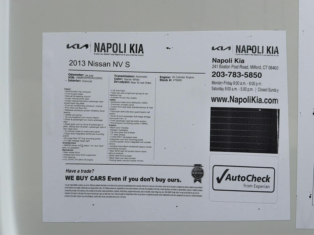 When you choose this Glacier White 2013 Nissan NV S with 94,548 miles, you are not just buying a used vehicle - you are investing in quality, reliability and peace of mind. Our clientele depend on us for Transparent Pricing, Convenience and, most importantly, Customer FIRST Service!